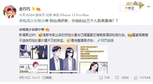 18日凌晨,金巧巧再次发文喊话张小寒,称:“我也很好奇,你说的这三个人到底是谁??”