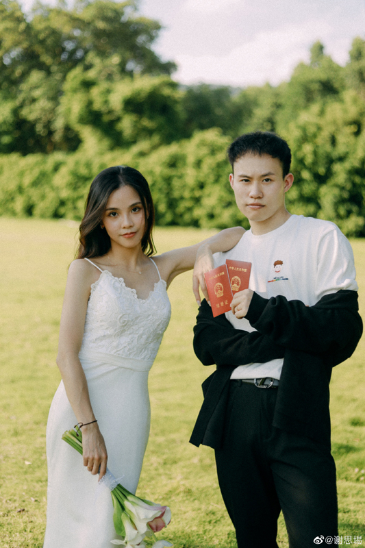 谢思埸在微博贴出了与新婚妻子的甜蜜合影,并且官宣结婚,他表示:“大喜之日,相识、相恋、相爱,相互一辈子。”