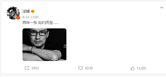 早在几天前的8月16日,汪峰在个人社交账号上发布新专辑动态,表示“两年一张,如遇而至…”,预告新专辑将在24日上线。