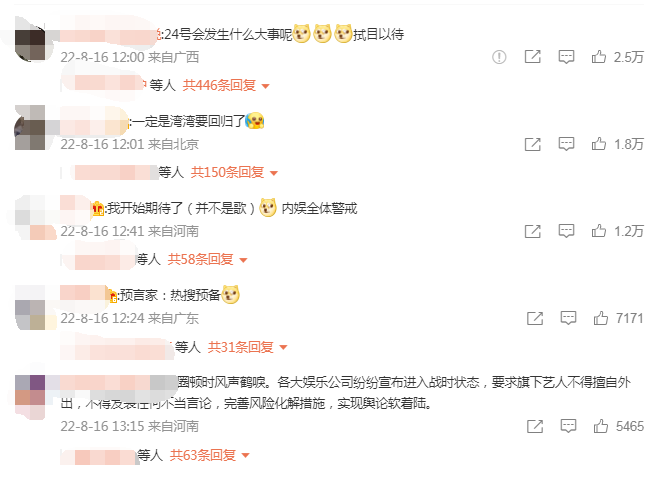 “24号会发生什么大事呢?拭目以待”,“我开始期待了(并不是歌),内娱全体警戒”,“预言家:热搜预备”,“娱乐圈顿时风声鹤唳”…