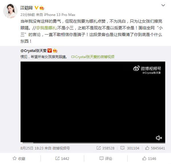 8月25日,张天爱在微博发音频爆料徐开骋出轨是惯犯,引发热议。而娜扎也转发张天爱的微博否认自己是小三,还表示看清了徐开骋的人品。