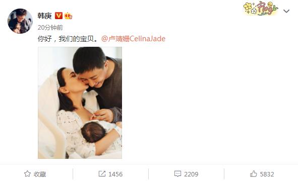 9月9日,韩庚发文晒出了一家三口的合影,宣布卢靖姗平安产女,一家三口的合照看起来十分温馨。
