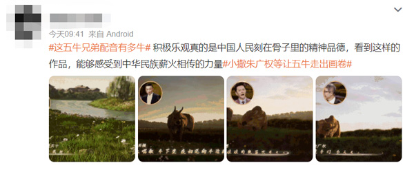 五位央视主持人的生动演绎,引发了网友热议:“特别喜欢这个舞台的创意,《诗画中国》真的把画卷带入了生活,用配音给我们呈现的五牛春耕好绝”“我都忍不住想要回去体验古人的生活了”,也让话题#这五牛兄弟配音有多牛#、#小撒朱广权等让五牛走出画卷#登上微博文娱榜、要闻榜、视频榜等榜单。