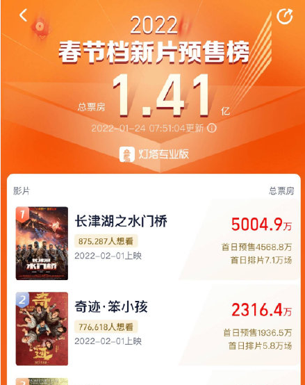 定档于大年初一,由吴京、易烊千玺等领衔主演的抗美援朝电影《长津湖之水门桥》预售票房突破5000万元,预售观影人次达到83.1万人次。