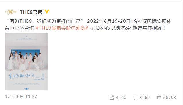 消息称,鉴于全国各地疫情持续散发,粉丝出行受限,为确保艺人和粉丝安全,原定于8月19-20日举行的THE9哈尔滨站毕业演唱会取消。据悉,此前THE9毕业演唱会也曾多次受疫情影响临时取消。